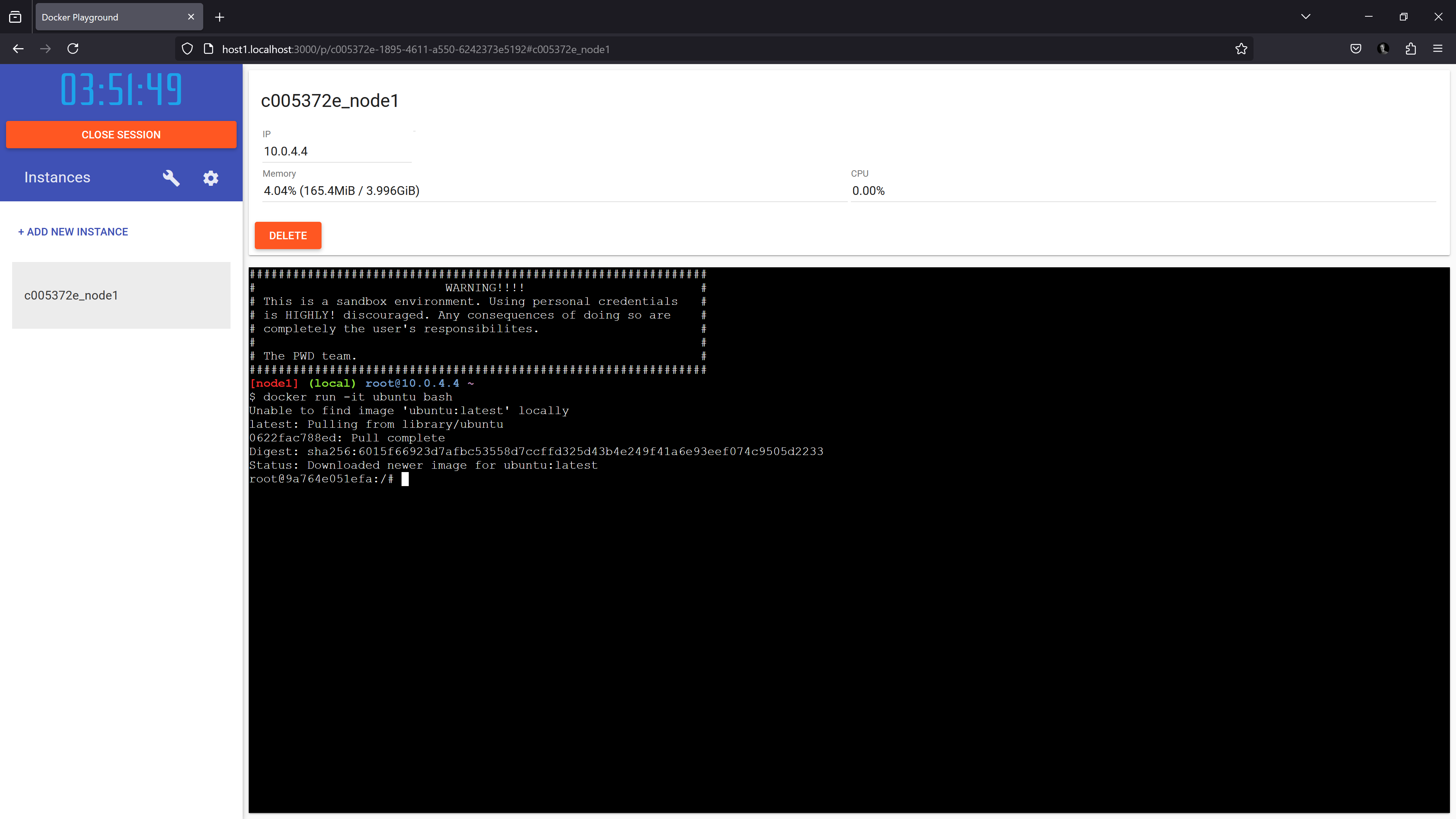 aus. Frage: Wo läuft der neu gestartete Container? Noch einmal zur Verdeutlichung: Ich habe eine Windows-Maschine mit WSL. Unter WSL läuft virtualisiert eine Linux-Distribution. Innerhalb dieser virtualisierten Linux-Umgebung habe ich einen Docker-Container mit Play-with-Linux gestartet. Dieser Container kann dann weitere Container starten mit franela/dind (Docker in Docker). Diese Container laufen ebenfalls innerhalb der Linux-Umgebung und werden als Instanzen in Play-with-Docker registriert. Der Ubuntu-Container, der in der PwD-Instanz gestartet wurde, läuft tatsächlich innerhalb dieser Instanz. Wir haben hier also tatsächlich einen Docker-Container, der innerhalb eines anderen Docker-Containers läuft.