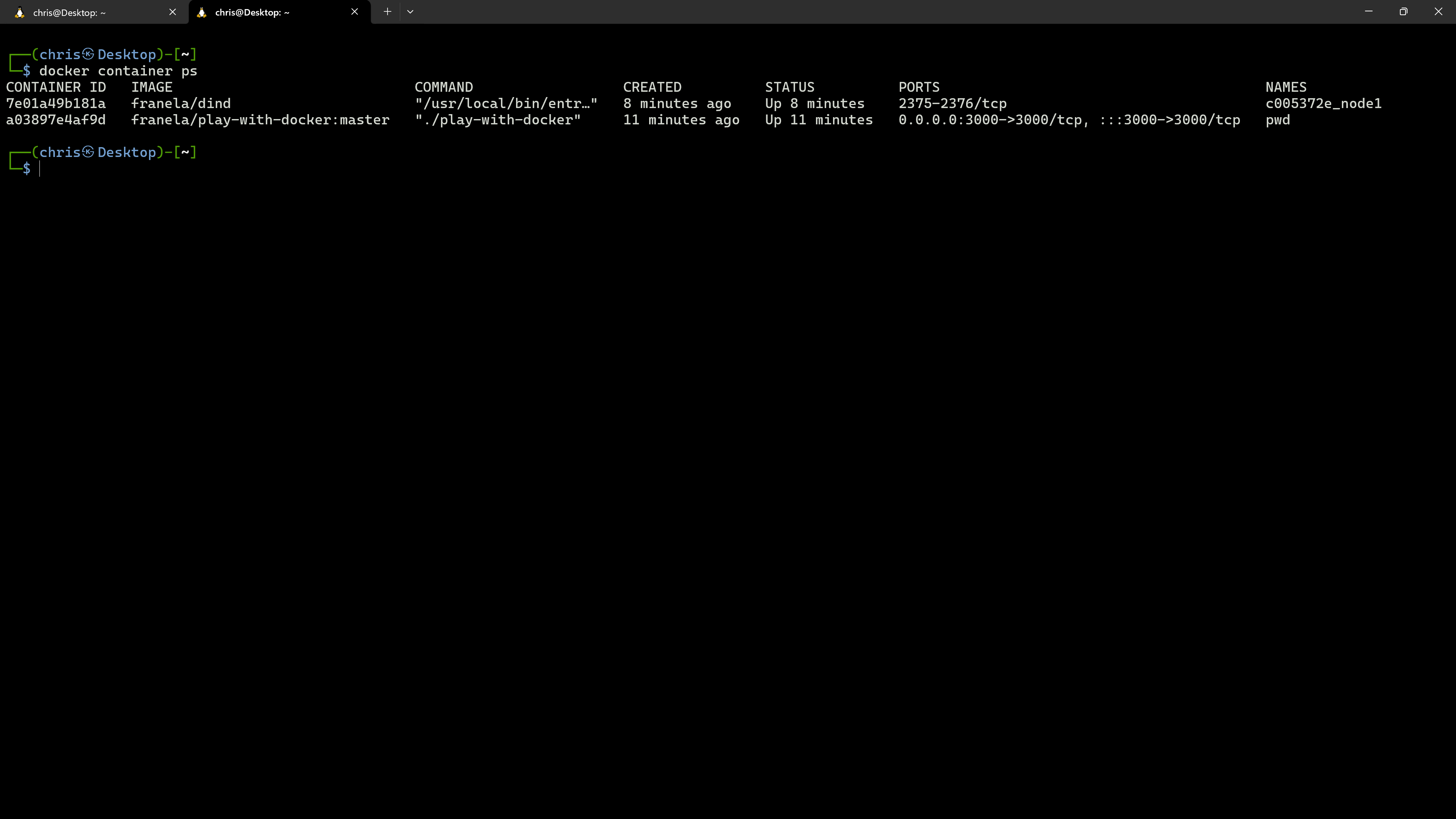 Du siehst nach dem Start einer PwD-Instanz, dass diese ein Docker-Container ist, das franela/dind als Image hat. dind steht hier für Docker in Docker, d.h., du hast einen Docker-Container, in dem du Docker verwenden kannst.